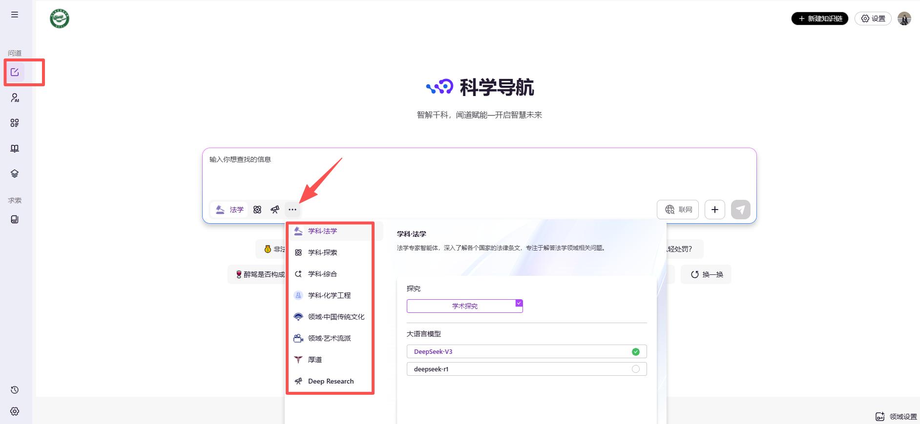 “闻道科学导航”主要包括三个关键词:AI研究员、AI学术追踪、AI知识库