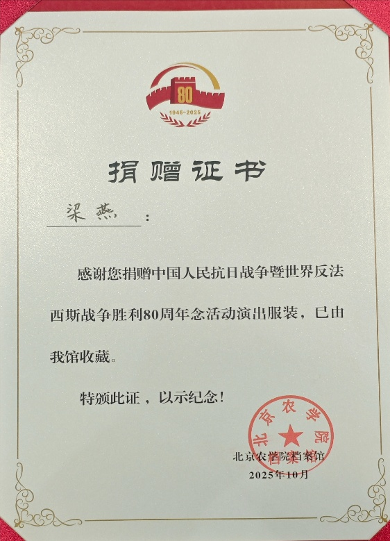 这一年,档案馆收获了诸多信任与深情。梁燕、韩天昊两位老师分别捐赠中国人民抗日战争暨世界反法西斯战争胜利80周年纪念活动演出服装,已由我馆正式收藏。