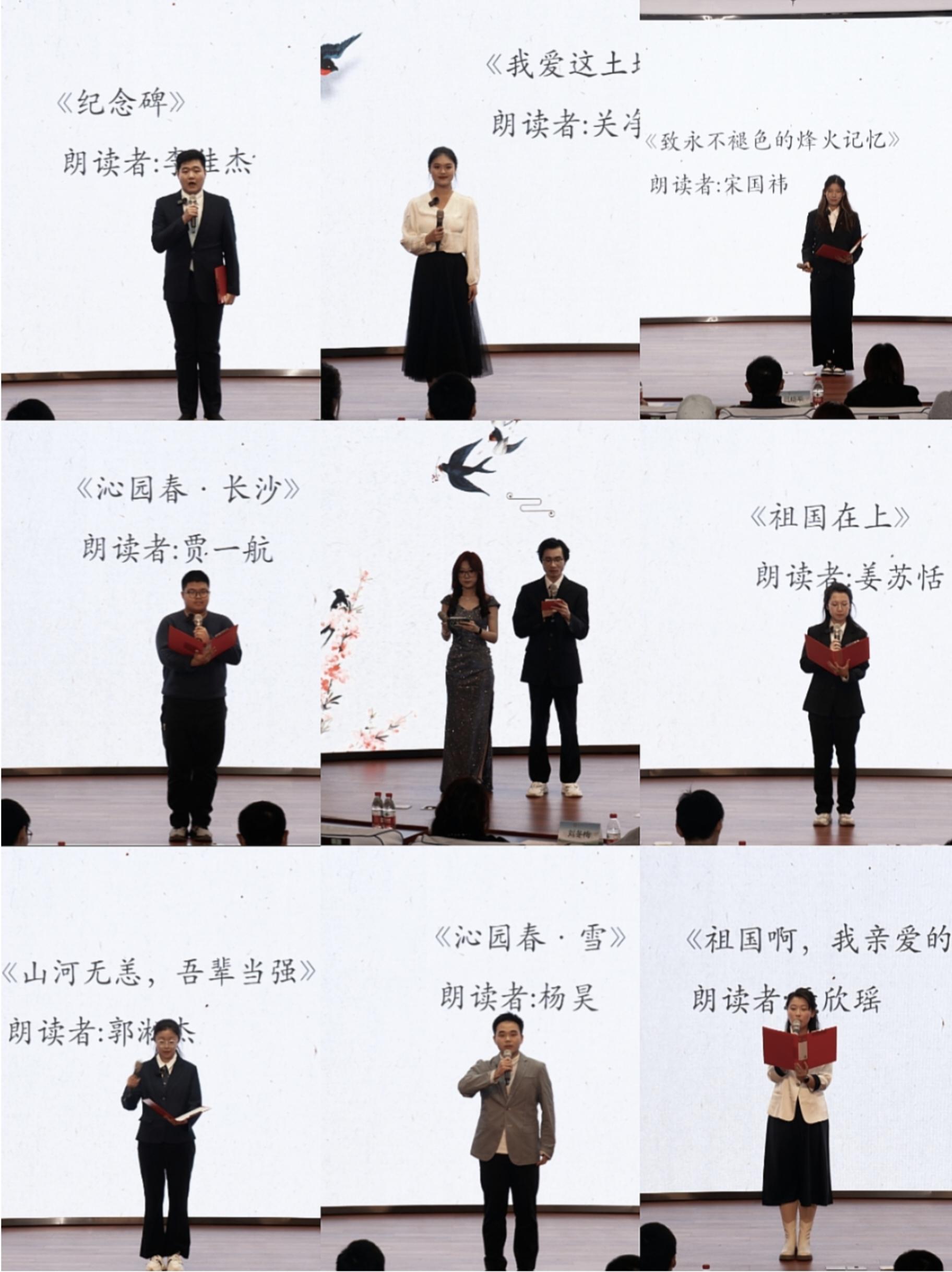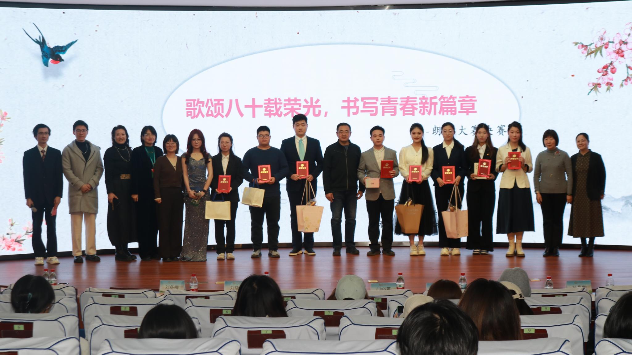 经过前期激烈角逐,8 位实力选手脱颖而出,成功晋级当晚的现场决赛。决赛现场氛围热烈而庄重,选手们精神饱满、意气风发,围绕大赛主题,结合自身感悟,用真挚的情感、抑扬顿挫的语调,深情演绎了一篇篇经典篇目与原创佳作。他们或追忆峥嵘岁月,歌颂八十载风雨兼程的辉煌成就;或立足青春当下,抒发勇担使命、续写华章的壮志豪情,每一段朗读都赢得了现场观众的阵阵掌声。