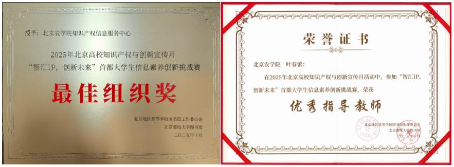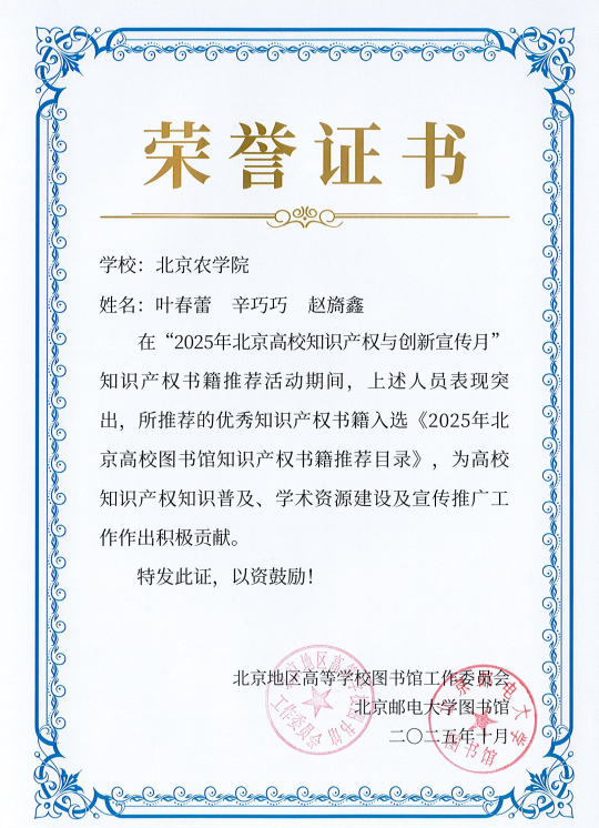 我校知识产权信息服务中心积极参加此次荐书活动,并组织专家推荐、编写读书心得,共推荐10本知识产权专业图书。通过图书馆微信公众号进行发布并组织全校师生投票,在师生中取得一定反响,所推荐的知识产权书籍入选《2025年北京高校图书馆知识产权书籍推荐目录》,中心叶春蕾、辛巧巧、赵旖鑫三位老师因表现突出,获得相应的荣誉证书。